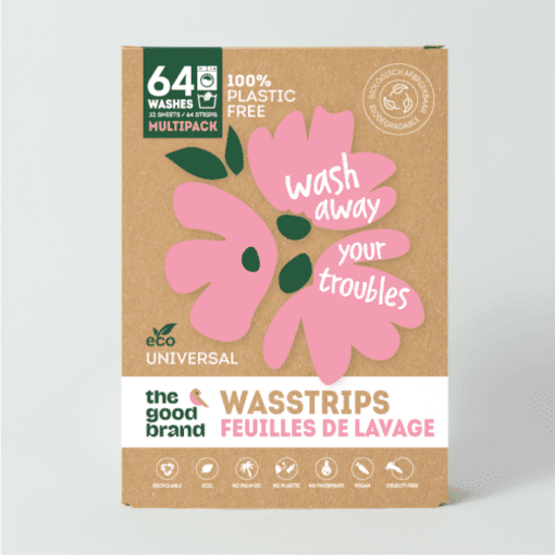 Was je kleding schoon en frist met natuurlijke wasstrips – vegan.  En… het sjouwen met zware flessen is ook verleden tijd. Wasstrips 64 wasbeurten Spring Breeze – The good brand